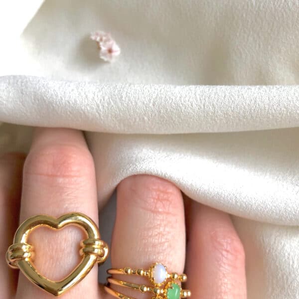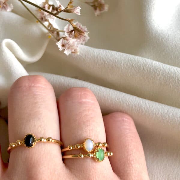 Bague en plaqué or, pierre ovale en quartz blanc et deux boules sur les extrémités