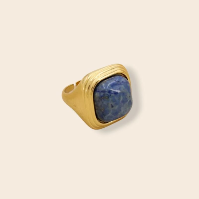 Bague vintage carrée avec pierre lapis lazuli en acier inoxydable doré