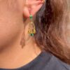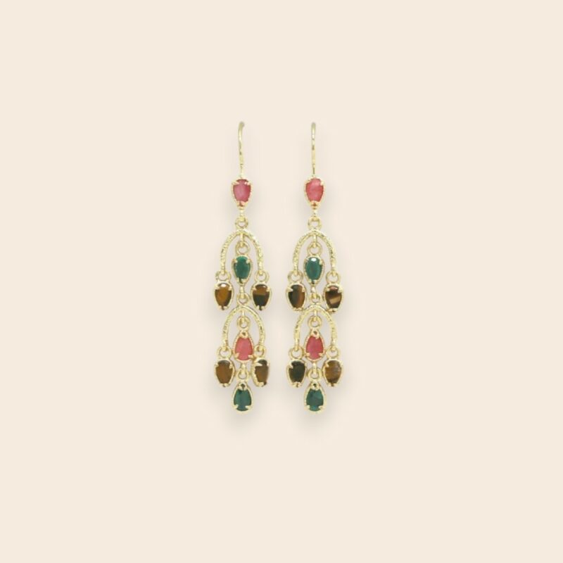 Boucles en double chandelier multi pierres malachite, œil de tigre et rhodochrosite, en acier inoxydable doré