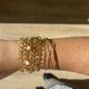 Manchette souple et nacre, modèle en acier inoxydable doré, manchette souple effet cote de maille serti de nacre en cabochon.