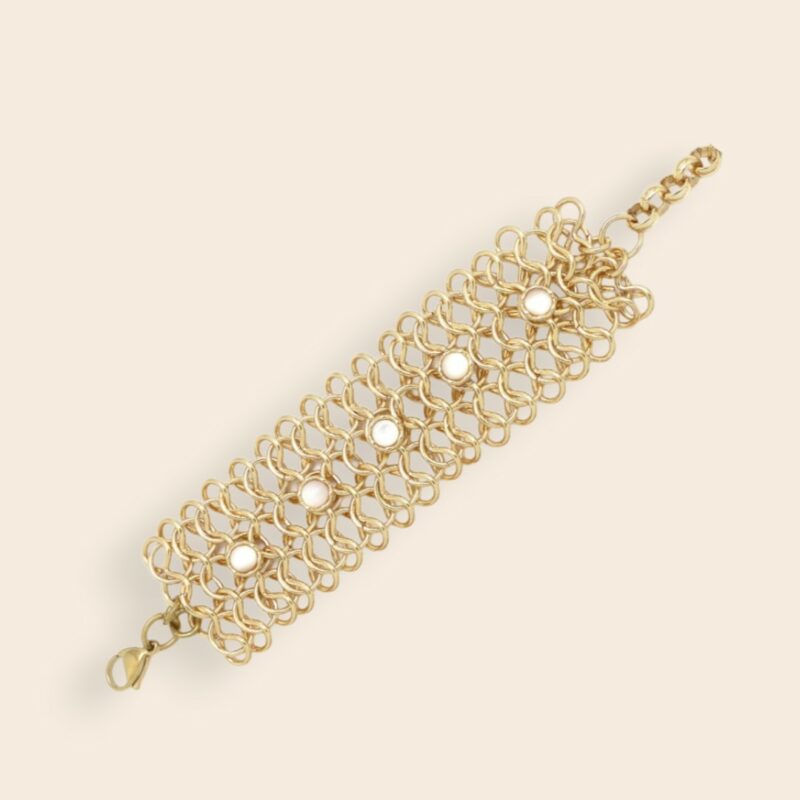 Manchette souple et nacre, modèle en acier inoxydable doré, manchette souple effet cote de maille serti de nacre en cabochon.
