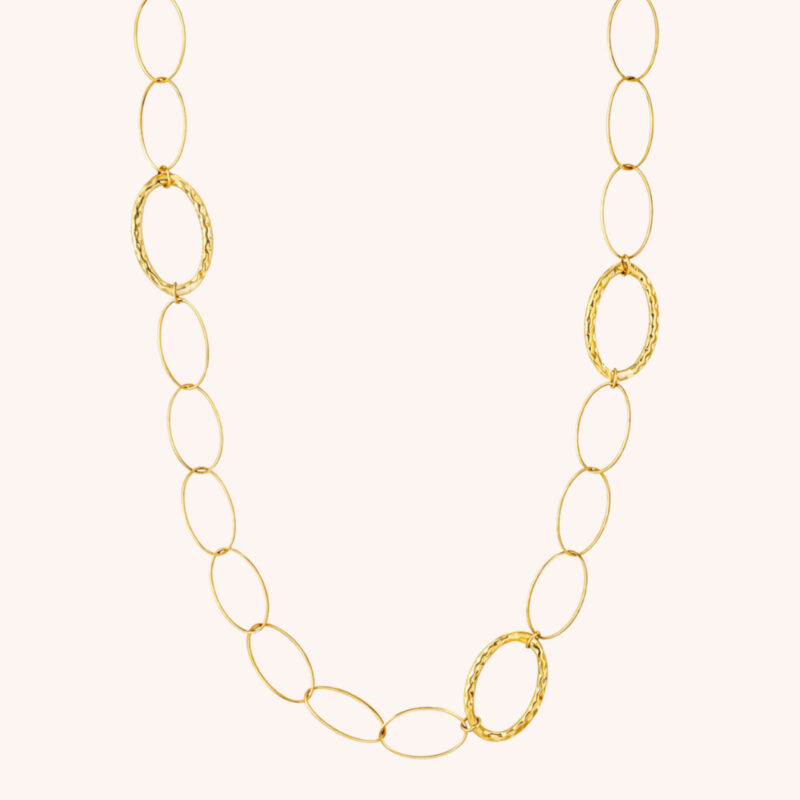 Sautoir mailles XL, sautoir en acier inoxydable plaqué or mailles ovales et détails maillons martelés.